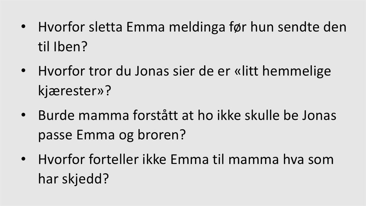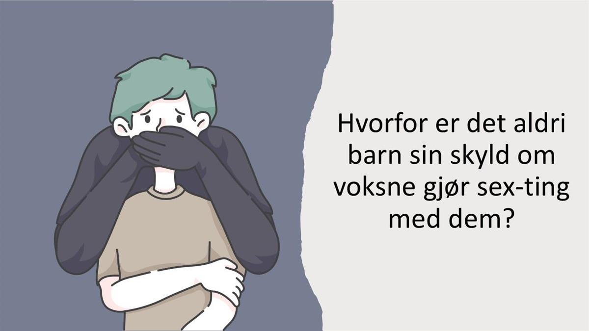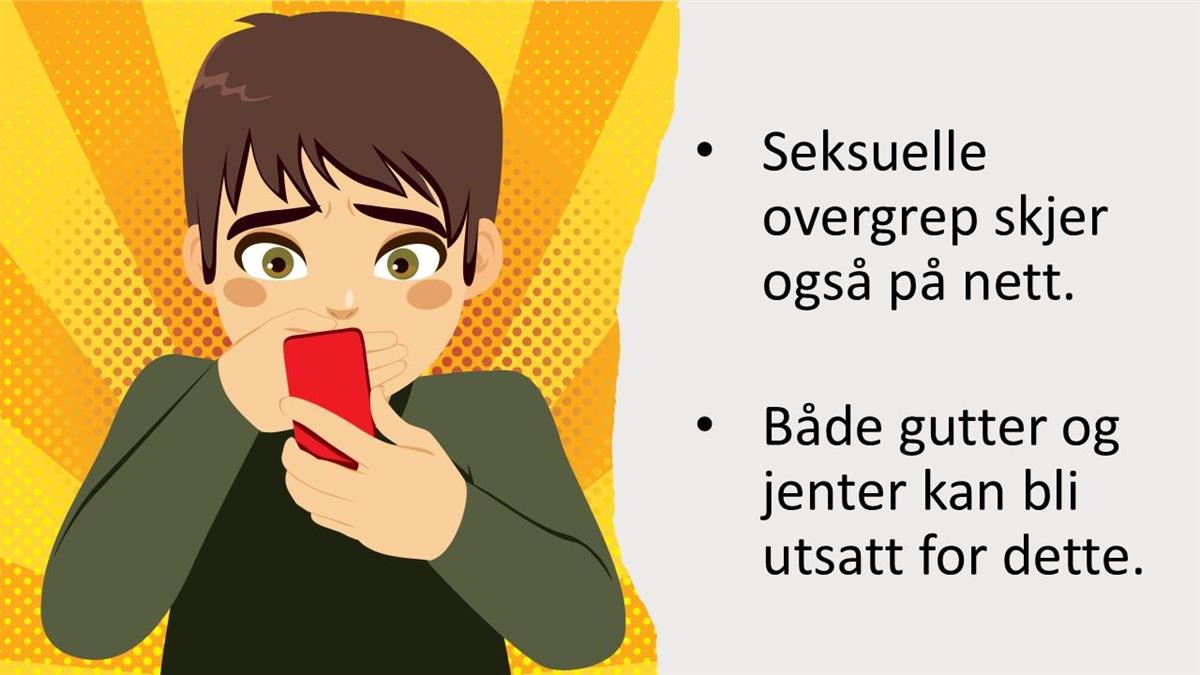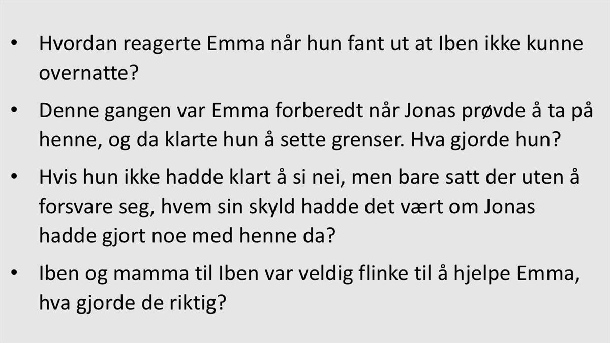- Det som ligger i undervisningsmaterialet til elevene her, er gjort så enkelt som mulig av flere grunner. Ikke alle er like komfortable med disse sårbare emnene, og vi kan også regne med at det er elever i rommet som har egenerfaring som de helst vil klare å holde skjult mens timen varer. Det viktigste er at elevene får sett filmene sammen med trygge voksne, og at de har fått med seg noen få punkter som du er med på å understreke etter filmene. Dersom dere har med helsesykepleier, eller lærer er trygg og komfortabel med å jobbe med dette med elevene, så suppler gjerne fra anbefalt ekstramateriale.