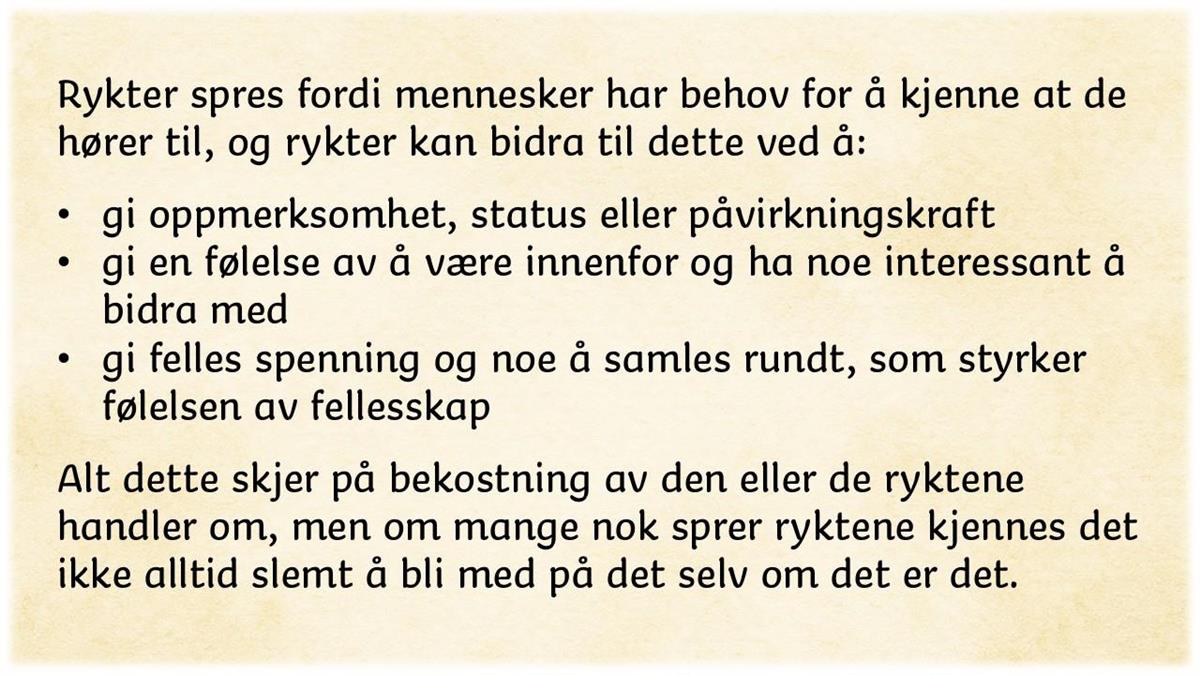 Elevene kommer noen ganger til oss for å snakke om rykter om seg selv. Vi lytter til det de forteller og forsøker å hjelpe dem med dette. Kanskje er det noe en kan rydde i? Noen en kan snakke med for å finne ut av dette og få ryktene til å stoppe. Rykter spredt på nettet kan være vanskelige å nøste i, og da kan det være riktig å inkludere flere for å få stoppet det som skjer.
