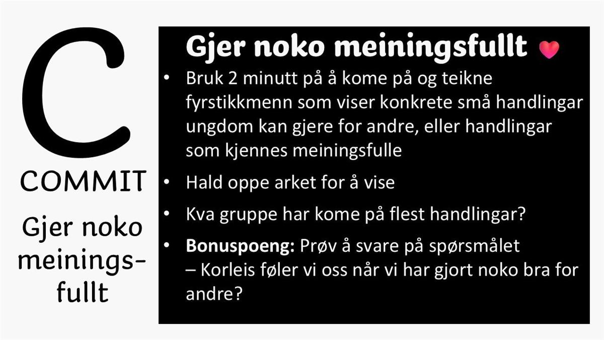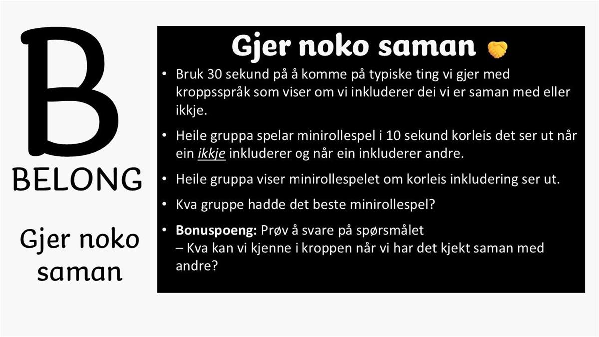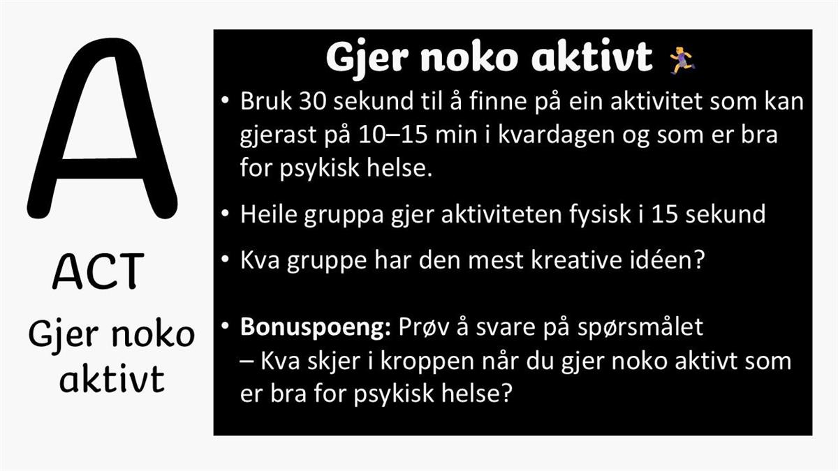 I timen får dei også lære litt om andre ting dei kan gjere for å ta vare på kroppen for å ta vare på si psykiske helse. Det er fint om de heime også ser litt på dei filmane og oppgåvene som ligg her, og kanskje kan de prate litt heime om kva som skal til for at ungdommen skal klare å gjere det dei treng for å ha det bra.
